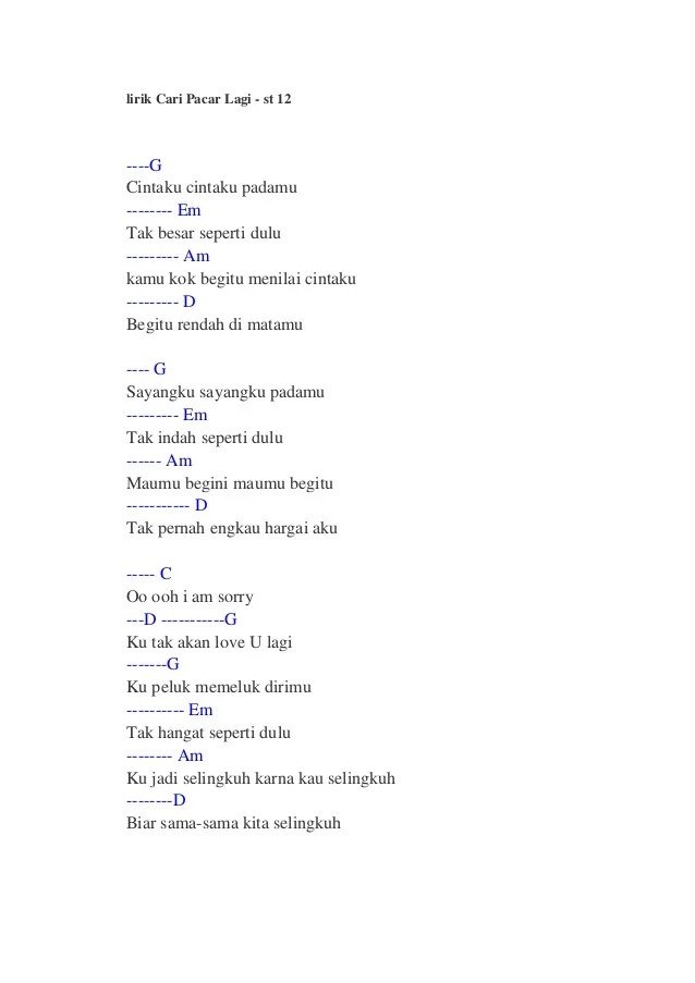 *) dm am menangis nangis sendiri dm am tak ada yang menemani dm am kucoba bangkit sendiri g sakitpun tetap sendiri…. Disaat ku terjatuh semua menghilang. I give up trying, at least for today. Dm am menangis nangis sendiri dm am tak ada yang menemani dm am kucoba bangkit sendiri g sakitpun. Nov 08, 2020 · lagu menangis semalam dirilis pada bulan januari 2002. Sinar jangan menangis chords by st12. C f c f c f g. Mar 14, 2015 · sinar jangan menangis chords by st12. Website yang berisi kumpulan chord (akord) / kunci gitar mudah dan dasar beserta lirik lagu indonesia maupun mancanegara. Last edit on mar 14, 2015. Menangis nangis sendiri dm am intro c f c f. 6,934 views, added to favorites 30 times.