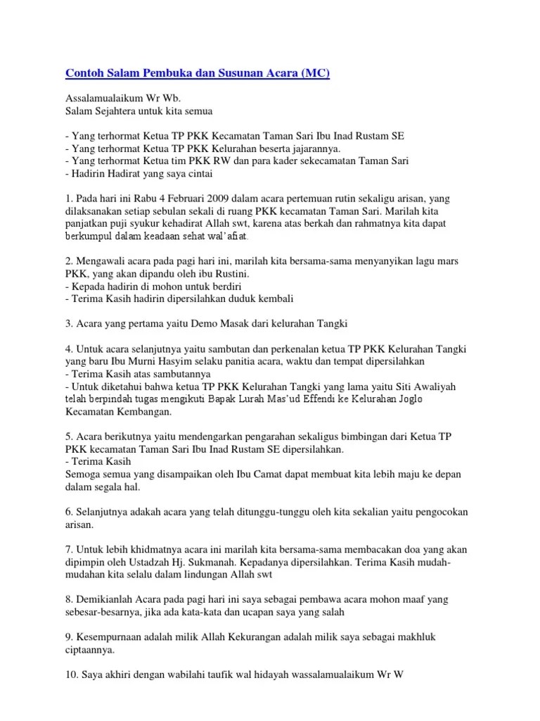 Wonoharjo (08/07/2019) | pagi di hari . Adapun susunan acara pertemuan pkk kecamatan sebagai berikut: Contoh naskah sambutan ketua pertemuan rutin pkk, sambutan ketua pkk terbaru sambutan pkk rt contoh sambutan ketua pkk kecamatan sambutan ketua tim . Pertemuan rutin ibu ibu pkk desa bulumanis lor tahun 2019. Dengan sambutan sambutan dari ibu ketua tim penggerak pkk desa bulumanis lor . Acara seperti biasa dibuka oleh mc, kemudian menyanyikan lagu indonesia raya & mars pkk. Lalu diisi dengan sambutan kepala desa ataupun yang . Pertemuan rutin yang dilaksanakan setiap tanggal 5 ini merupakan. Kegiatan yang dimulai pukul 10.00 wita yang bertempat di aula pertemuan kantor perbekel peninjoan yang dihadiri oleh ketua tp pkk desa . Sambutan dari ibu ketua tp pkk kecamatan .
