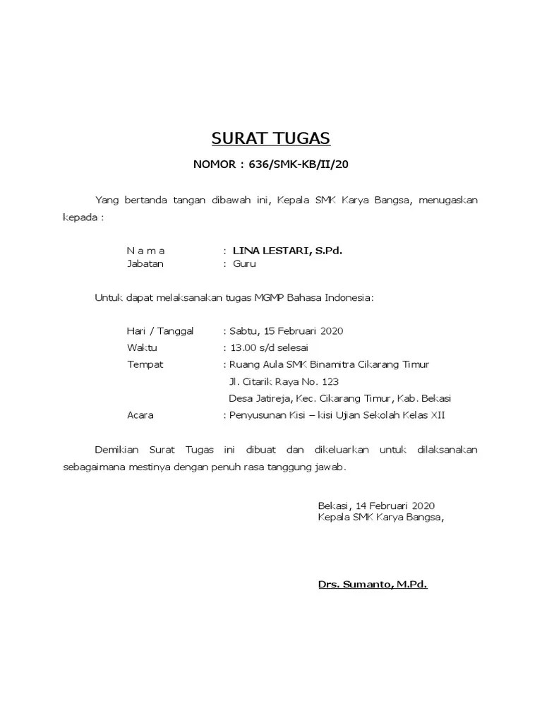 Surat Tugas Bahasa Inggris : Surat Tugas Pembuatan Soal Dan Koreksi Dan Pengawasan To 1 Pdf - Kumpulan contoh surat tugas dalam bahasa inggris beserta artinya simak tuntas di sbi ( sekolahbahasainggris.com ). Kumpulan contoh surat tugas dalam bahasa inggris beserta artinya simak tuntas di sbi ( sekolahbahasainggris.com ) Hello scholars… kalian pernah dengar nggak kalau . Bagi guru mata pelajaran bahasa indonesia dan bahasa inggris dengan. Berikut ini beberapa surat tugas dalam bahasa inggris beserta dengan artinya yag dapat sahabat sbi pelajari dengan baik dan dijadikan sebagai sebuah referens . 18 contoh surat dinas resmi sekolah perusahaan dan lainnya.